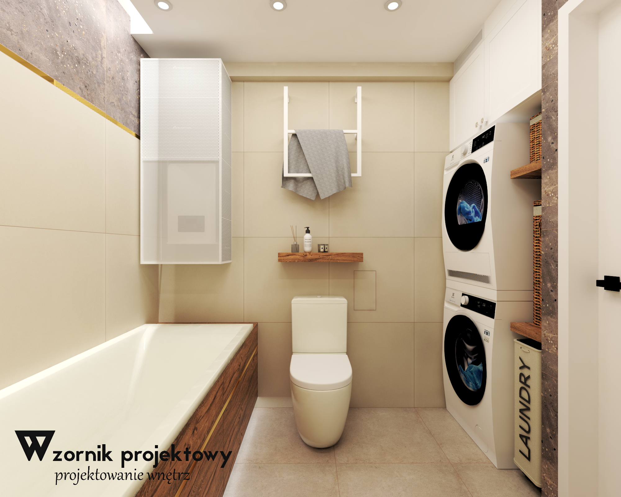 W projekcie powiększyliśmy nieco powierzchnię – wyposażenie, które miało być użyte, było po prostu większych rozmiarów niż te z lat 90 tych, które jest tam teraz. Większa pralka, osobna suszarka, dodatkowe miejsce do przechowywania a nawet większa wanna – to wszystko wymusiło skrócenie ścianki działowej, połączenie toalety z łazienką i zmiany w dotychczasowym układzie funkcjonalnym.
