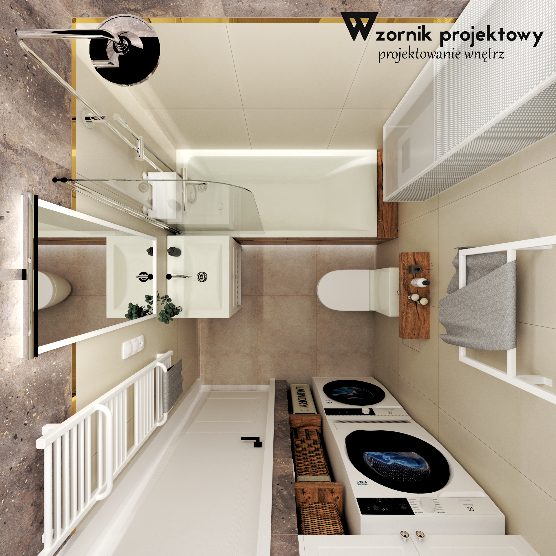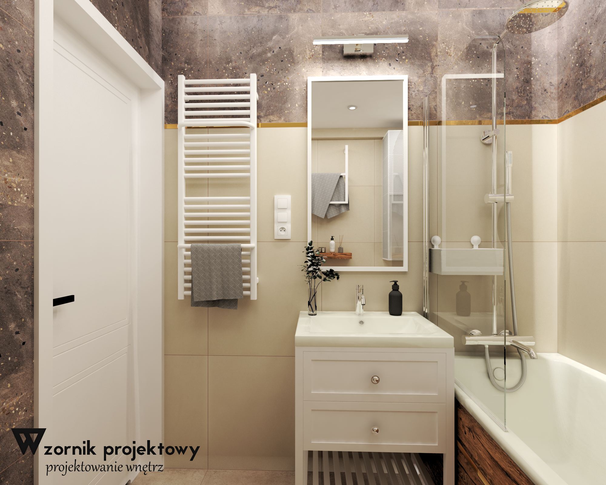 Bardzo jesteśmy ciekawi efektu końcowego remontu tej łazienki. Na razie zdradzamy same wizualizacje. Obecnie jest to pomieszczenie niewielkich rozmiarów, dosyć ciemne i dodatkowo (żeby nie było zbyt prosto;) podniesione o około 5 cm powyżej poziomu posadzki w całym mieszkaniu. Być może uda się pokazać w późniejszym czasie całą metamorfozę.