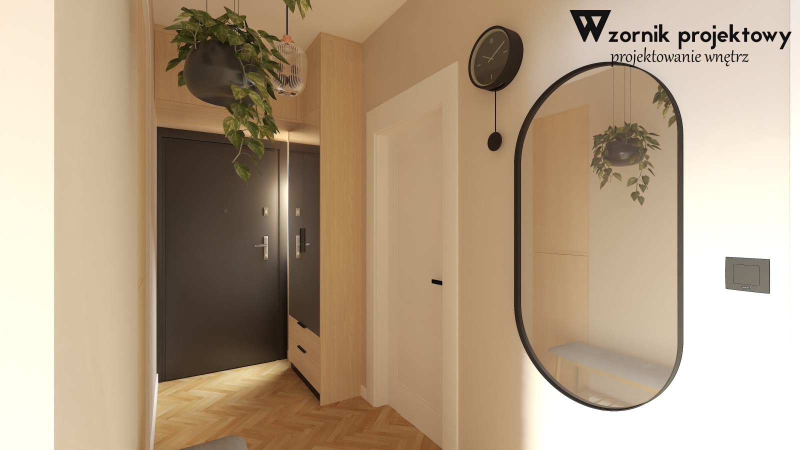 Na ścianach zastosowaliśmy delikatny i prosty efekt dekoracyjny, który nawiązuje do ostatnich trendów (a może powrotów?) do owali, łuków i naturalnych barw ziemi. Motyw łuku powtarza się w kształcie lustra, stołu, lamp a nawet tablicy magnetycznej. Odcień forniru został wybrany przez Właścicielkę – jasne drewno nie przytłacza w tych niewielkich pomieszczeniach i daje możliwości różnej aranżacji w przyszłości. Z uwagi na czarny kamienny blat kuchenny dodaliśmy kilka drobnych czarnych detali, aby całe wnętrze było spójne. Kolorem przewodnim, oprócz motywu drewna był bladoniebieski – dodał lekkości i świeżości aranżacji oraz dobrze spasował się z granatową sofą i kolorem ścian.