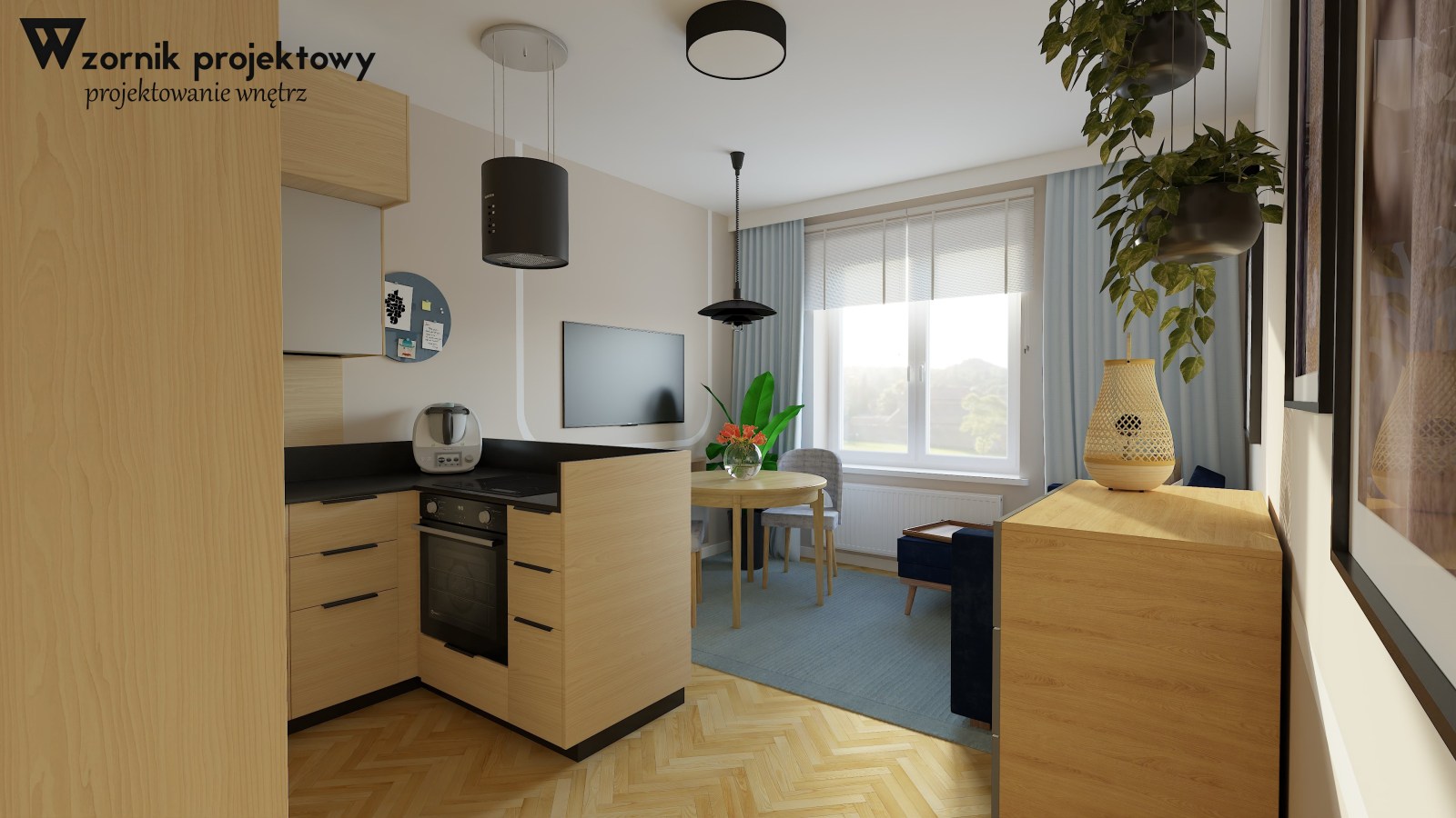 Udało nam się stworzyć dość dobrze wyposażony aneks z półwyspem oraz ładnie oświetloną naturalnym światłem część „salonową” :). Wyższy fartuch blatu kuchennego zakryje ewentualny bałagan, a sam półwysep na szafkę otwieraną od strony salonu, co zwiększa jego dostępność. Lampa nad stołem ma ruchomy wysięgnik – można ją podnieść do góry, gdy będzie oglądana telewizja. Sofa jest niewielka ale w razie potrzeby można ją rozłożyć do spania. Puff może służyć zarówno jako przedłużenie miejsca do siedzenia oraz jako stolik kawowy, jeśli postawimy na nim dużą tacę. Na małych powierzchniach takie rozwiązania są na wagę złota.