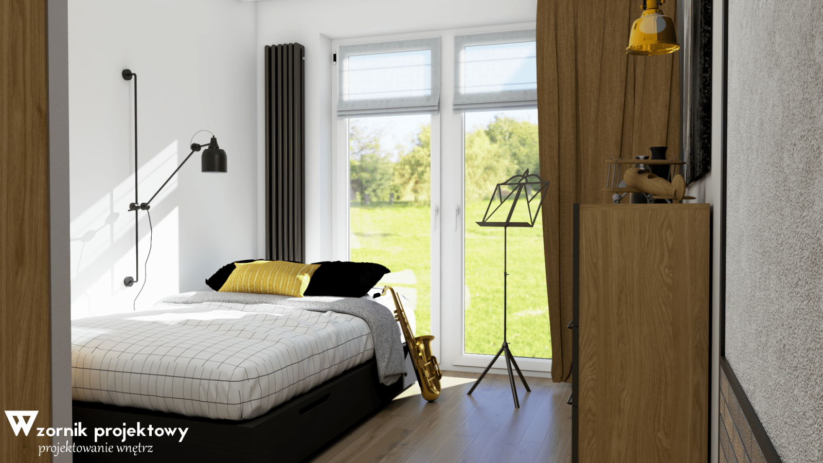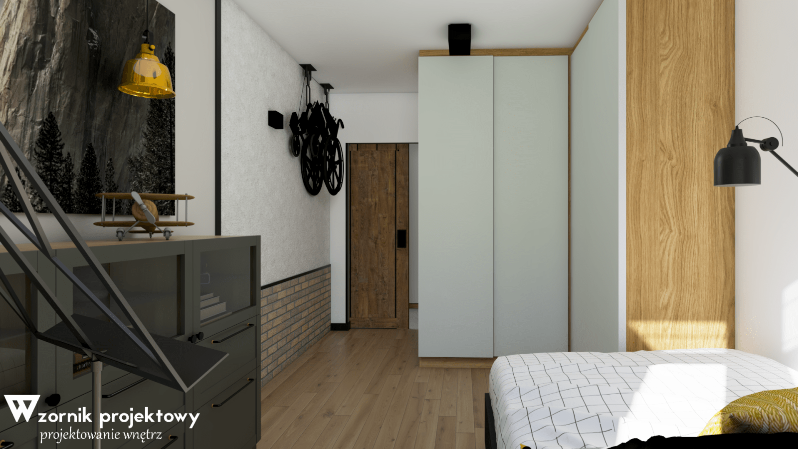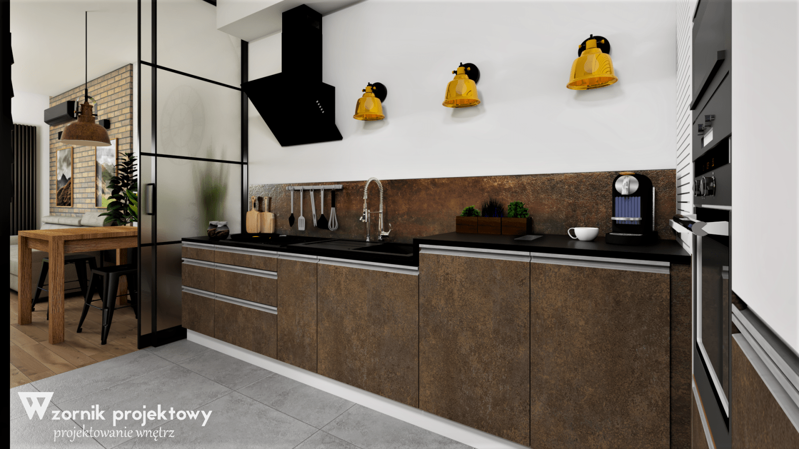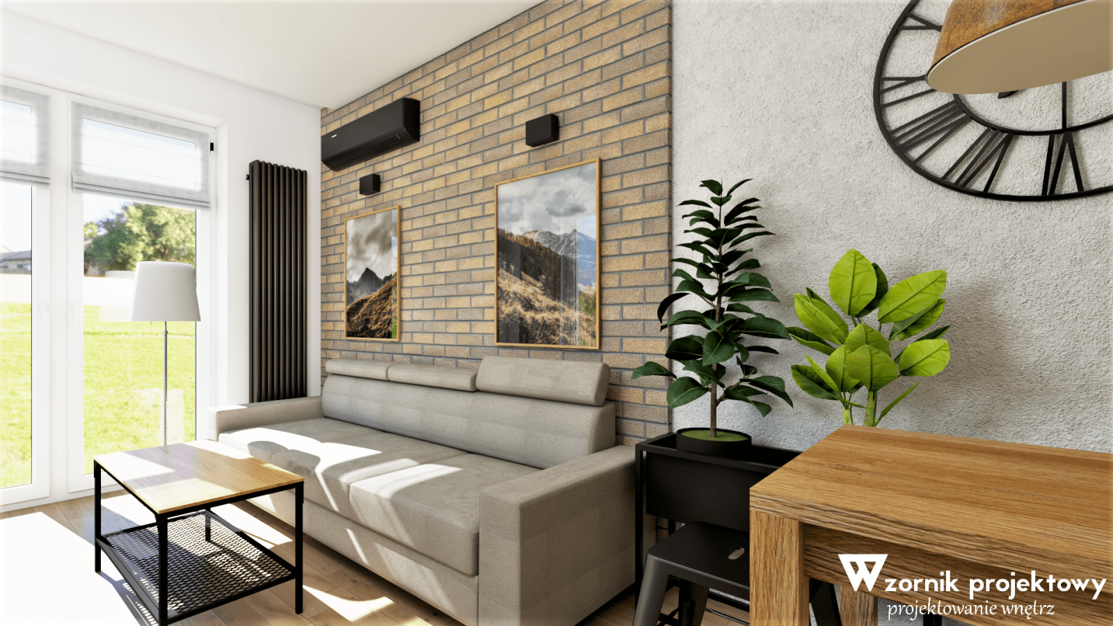Wizualizacje niedużego mieszkania w stylizacji loftowej.