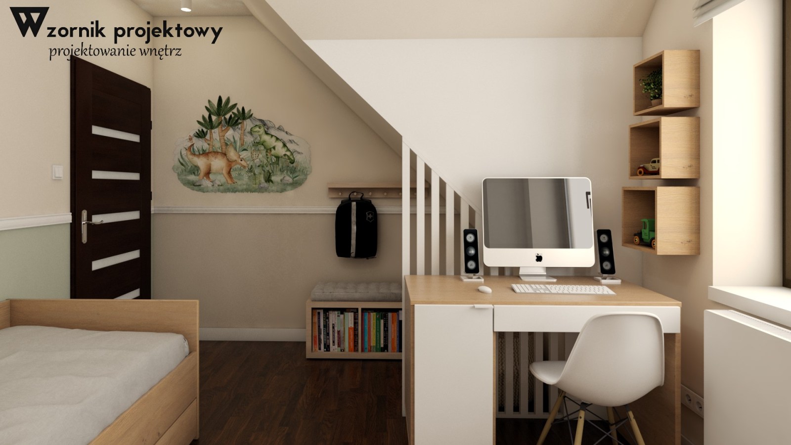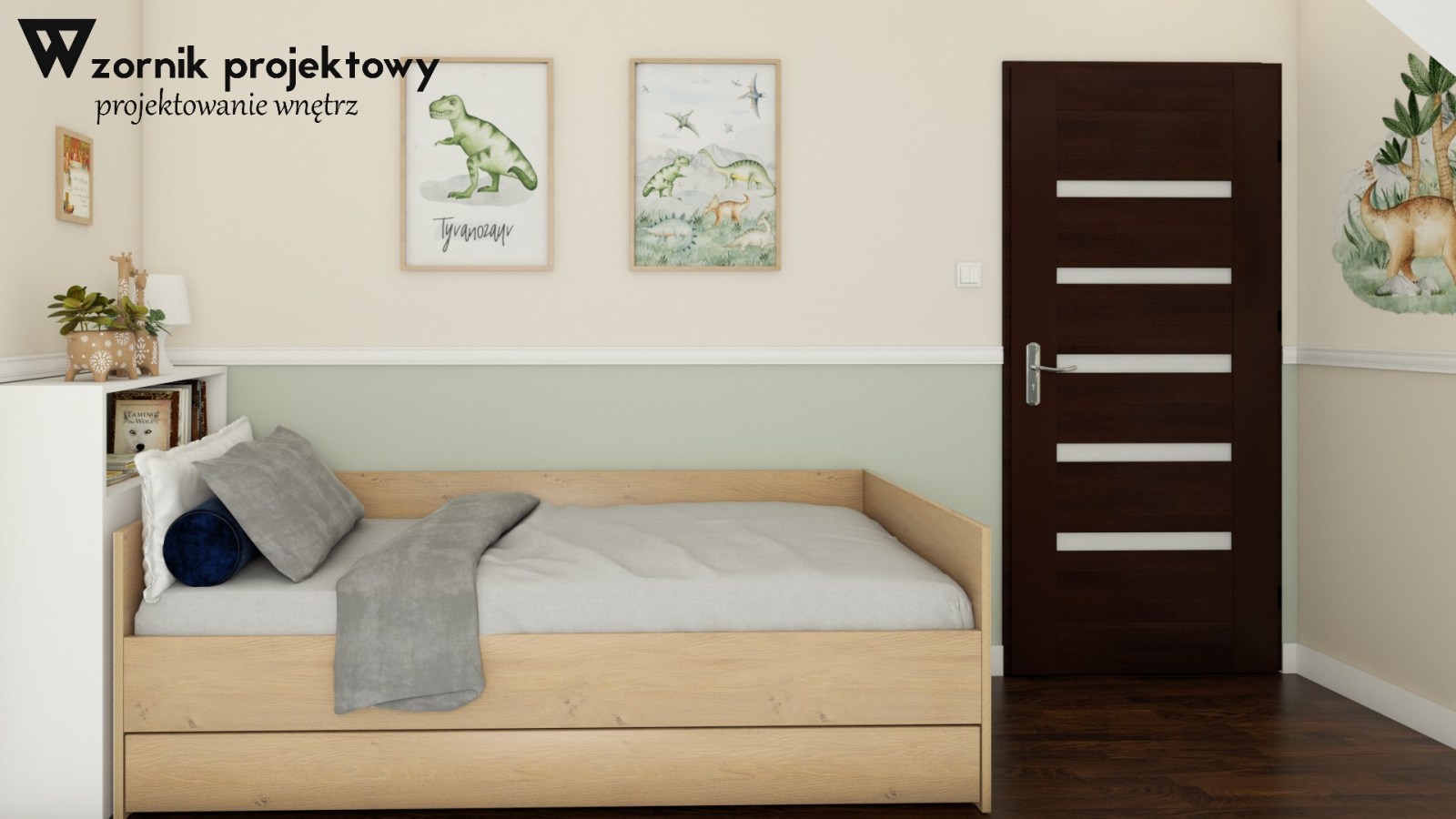 Na koniec warto wspomnieć, że staraliśmy się wykorzystać dekoracje, które podkreślą zainteresowania małego właściciela. Na ten moment wybór padł na naklejki ścienne – dinozaury, oraz plakaty z nimi, które fajnie wkomponowały się w ogólny wygląd pokoju.
