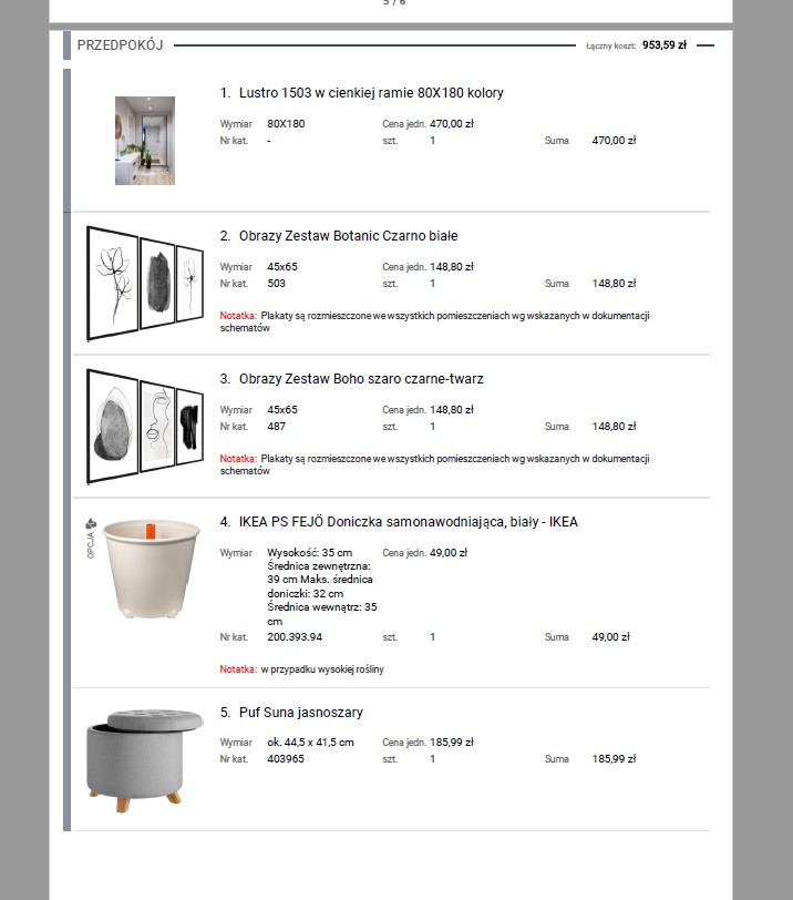 4. sporządzenie listy dekoracji i wyposażenia oraz plansz zestawień kolorystycznych dla każdego pomieszczenia (możliwe 2 tury zmian)