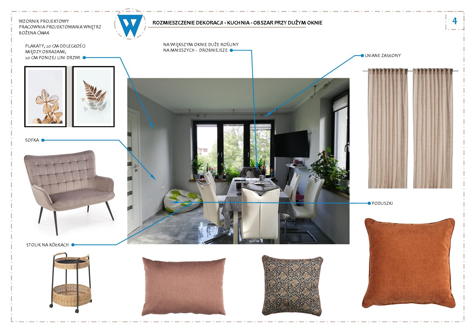 DLA KOGO: dla osób, które chcą odświeżyć mieszkanie bez remontu, którym wydaje się, że mieszkanie jest „puste”i bez wyrazu (praca obejmuje dobór dekoracji i tkanin do wnętrza)